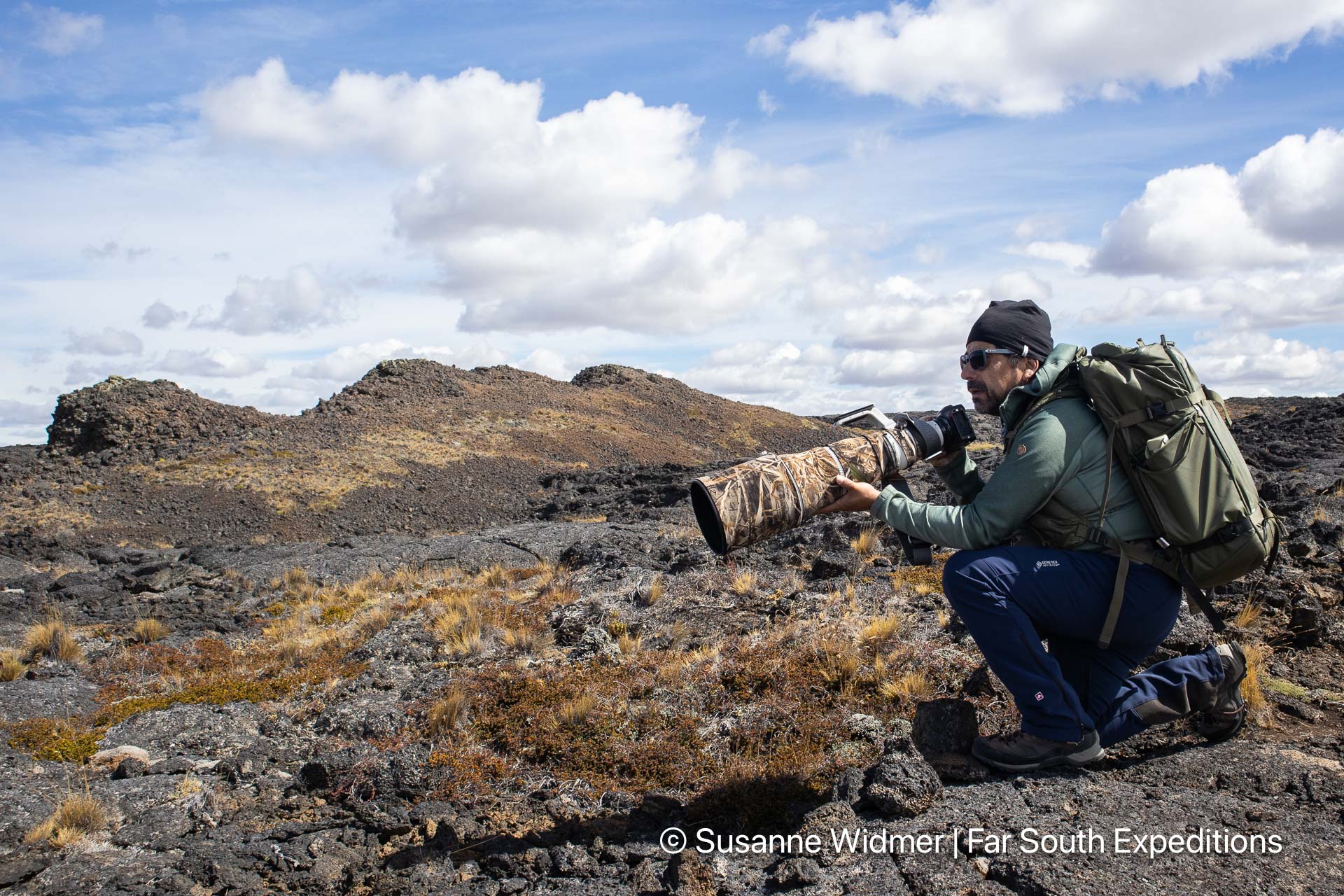 On our circular hike, we cross various lava fields and marvel at the sight of massive volcanic cones. Among the bird species we are likely to see during the day, are the Grey-hooded Sierra-Finch, Austral Negrito, Cinnamon-bellied and Dark-faced Ground-Tyrants. We also have a good chance of seeing Cinereous Harriers, Falcons and Caracaras. Lizards, for their part, enjoy being warmed by the sun on the dark lava stones. Individuals of the genus Liolaemus are particularly common. In the steppe, just outside the rugged lava fields, there are mammals such as guanaco, gray fox, Patagonian skunk and Big hairy Armadillo.